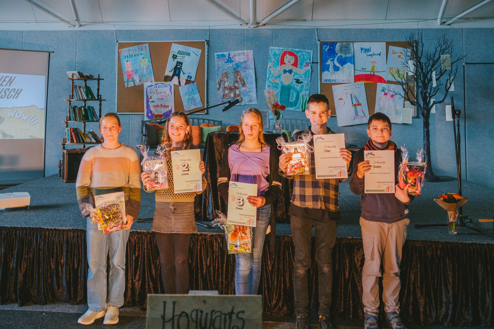 Die Aufregung war förmlich greifbar, als die Finalisten die Bühne betraten. In zwei Durchgängen wurde der Wettbewerb ausgetragen: Zuerst lasen die Fünftklässler, bewertet von einer aufmerksamen Jury aus Sechstklässlern. Danach wurden die Rollen getauscht. Die Reihenfolge wurde per Los entschieden, was für zusätzliche Spannung sorgte. Souverän und mit viel Charme moderierten Evi und Magnus (Klasse 6a) das Programm.